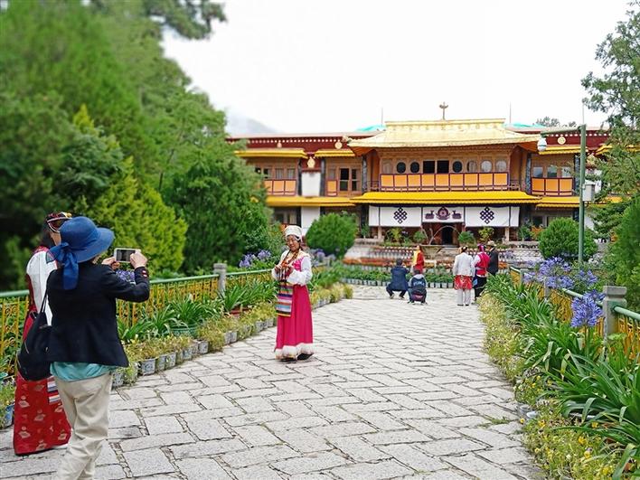 羅布林卡內(nèi)一步一景,每一處都能發(fā)現(xiàn)各類品種的花卉,在達旦明久頗章前面的水池內(nèi),幾朵睡蓮在雨水的滋養(yǎng)下盡情舒展開來。宮殿內(nèi)、石板路邊擺放的一盆盆盛開的鮮花,像是臉上堆滿了笑容的少女。人們對于優(yōu)美的風景總是毫無抵抗力,紛紛拿起手中的相機、手機拍照留念,讓美好瞬間定格于此。連一旁休憩的老奶奶都情不自禁地想幫路人拍照。