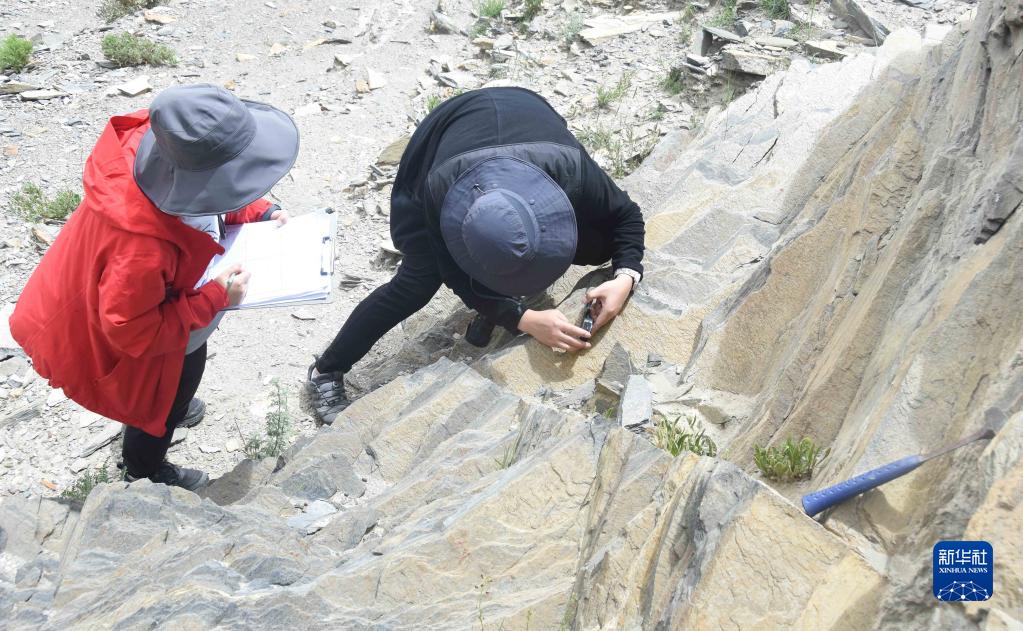 8月21日,在西藏日喀則市一處山體,科考隊(duì)員使用地質(zhì)錘、羅盤等工具,進(jìn)行地質(zhì)災(zāi)害鏈科考工作。新華社記者 杜剛 攝