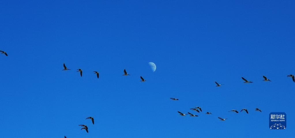 候鳥飛過唐嘎濕地(12月11日攝,手機照片)。新華社記者 沈虹冰 攝