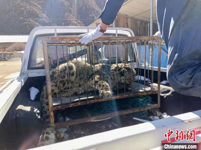 圖為工作人員將雪豹運送至林芝市野生動物收容救護站?!×种ナ辛植菥止﹫D