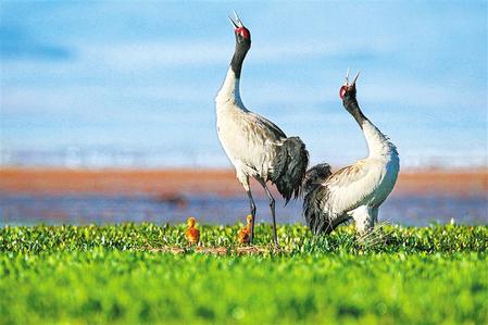 棲息在尕海濕地的國家一級保護動物黑頸鶴。 新甘肅·甘肅日報通訊員 張勇