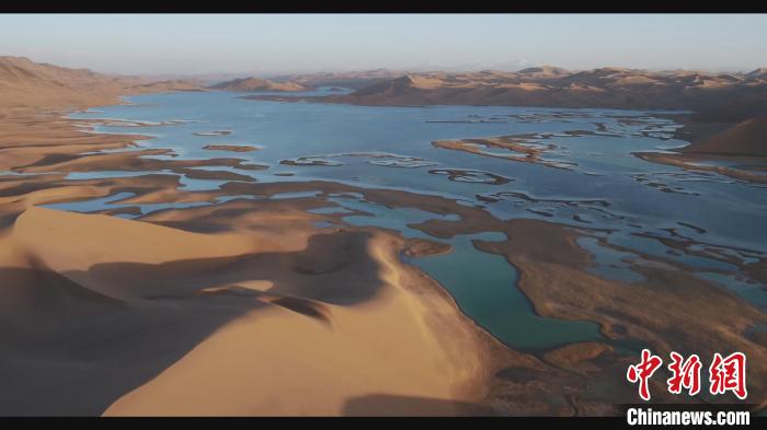 位于庫(kù)木庫(kù)里沙漠腹地的沙子湖薄冰化盡,蔚藍(lán)的湖水與金黃的沙山、遼闊的碧空交相輝映?!∩轩i 攝