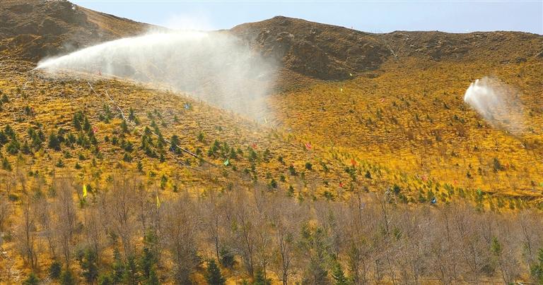 圖為拉薩南北山綠化工程的自動智能澆水系統(tǒng)在給寶瓶山樹林澆水。 記者 格桑倫珠 實習(xí)生 達(dá)娃宗巴 攝