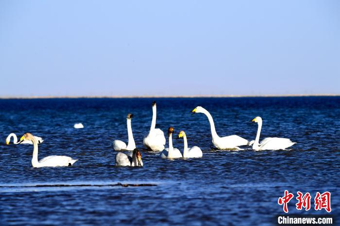 圖為天鵝群在湖中覓食?!〈饔婪?攝