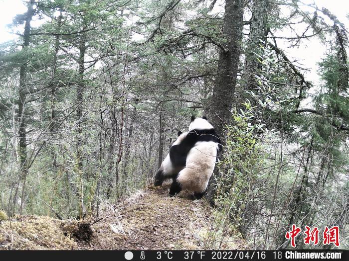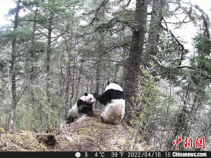 為了打敗競(jìng)爭(zhēng)者,平時(shí)呆頭呆腦、憨態(tài)可掬,有點(diǎn)傻萌的“滾滾”秒變“功夫熊貓”,電光火石的出拳速度和直取要害的攻擊路線,精彩激烈的拳擊、摔跤、柔術(shù)等看家本領(lǐng)統(tǒng)統(tǒng)用上,甚至為了提高自身氣勢(shì),不惜使出“獅吼功”,試圖在氣勢(shì)上壓倒競(jìng)爭(zhēng)對(duì)手。而這一切只是為了選擇優(yōu)秀的基因,以利于大熊貓種群在嚴(yán)酷的自然環(huán)境中繁衍生存。此次監(jiān)測(cè)視頻中,出現(xiàn)3只大熊貓同框畫(huà)面,其中兩只雄性大熊貓因爭(zhēng)奪交配權(quán)出現(xiàn)吼叫、打斗行為;一段視頻中,出現(xiàn)兩只大熊貓“打情罵俏”求偶交配畫(huà)面。