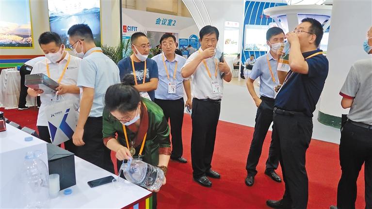 近年來,西藏加快發(fā)展飲用水產業(yè),積極拓展飲用水產品銷售渠道,在區(qū)內外各種展覽會、展銷會、博覽會上大力推銷水產品。 圖為2020廈門國際投資貿易洽談會暨絲路投資大會上,與會者在展示展銷會現(xiàn)場品鑒西藏“地球第三極”產業(yè)發(fā)展有限公司生產的天然飲用水產品。(資料圖片)記者 王超 攝