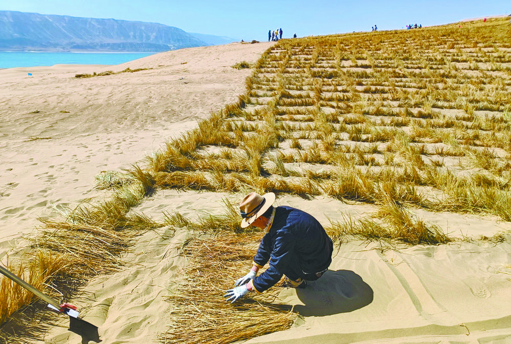 整齊排列的草方格,隨風(fēng)搖曳的烏柳樹,生機勃勃。青海省海南藏族自治州共和縣龍羊峽庫區(qū)北岸——曾經(jīng)的不毛之地,如今已煥然一新,一條條綠色長廊盡顯生命的力量。自生態(tài)項目建設(shè)以來,共和縣通過草方格沙障與烏柳插桿水鉆造林、檸條直播及沙蒿撒播相結(jié)合等方法進行荒漠化治理,造林成活率達到90%以上,創(chuàng)造出龍羊峽北岸的“綠色奇跡”。