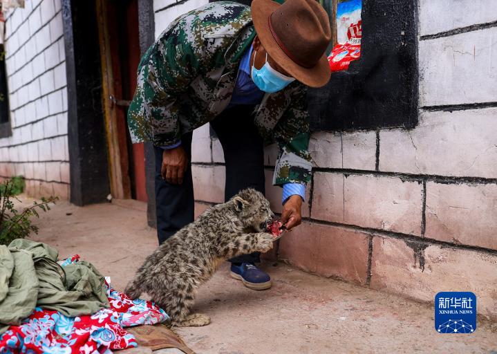 格桑頓珠在給被救助的雪豹幼崽喂食(10月11日攝)。 新華社記者 姜帆 攝