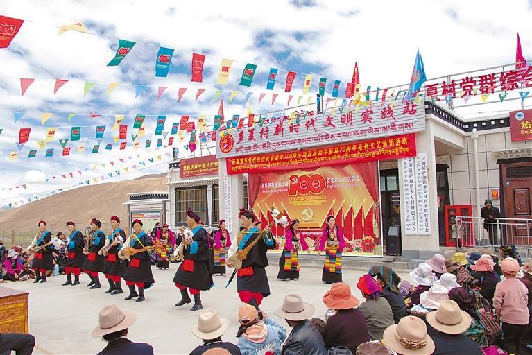 2021年7月2日,西藏自治區(qū)薩迦縣多夏村村民在新時代文明實(shí)踐站參加慶祝中國共產(chǎn)黨成立100周年和西藏和平解放70周年活動。