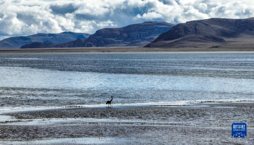 9月16日在多慶湖邊拍攝的黑頸鶴(無(wú)人機(jī)照片)。新華社記者 晉美多吉 攝