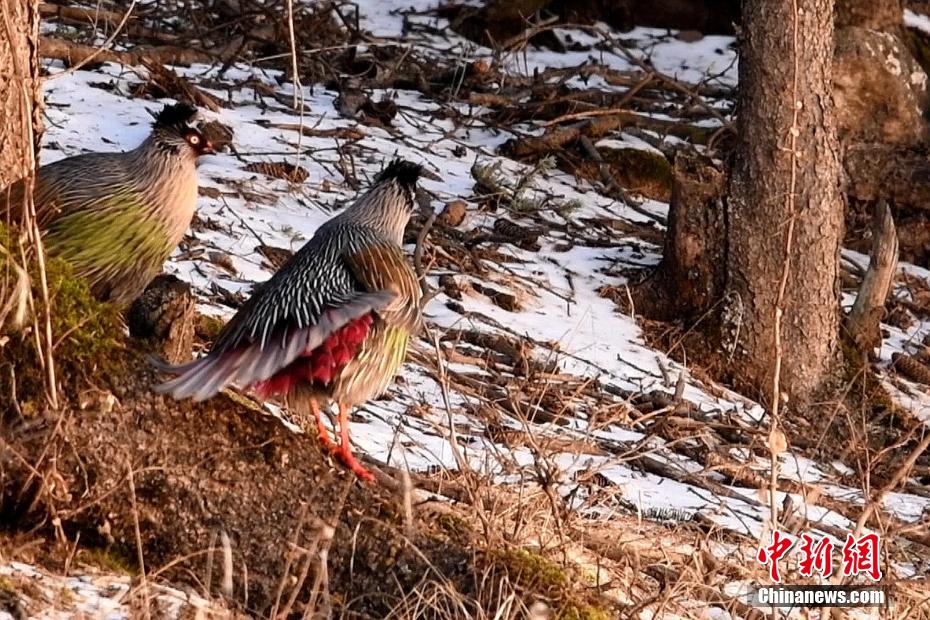高原初冬,在位于祁連山國(guó)家公園青海片區(qū)的海北州門源縣,寺溝管護(hù)站管護(hù)員在日常巡護(hù)途中,拍攝到幾只國(guó)家二級(jí)保護(hù)動(dòng)物血雉在林間悠閑覓食的珍貴影像。血雉是高寒山地森林及灌叢雉類,棲息于雪線附近的高山針葉林、混交林及杜鵑灌叢中,海拔高度多在1700-3000米,主要分布于中國(guó),系中國(guó)特有物種。血雉素有高原“顏值擔(dān)當(dāng)”物種之稱,血雉外形似眼戴太陽鏡、腳著紅色小靴,行進(jìn)跳躍間時(shí)不時(shí)以喙梳理“漸變色”羽毛?;顒?dòng)時(shí)常有雄鳥擔(dān)任警衛(wèi),遇危險(xiǎn)時(shí)擔(dān)任警衛(wèi)的雄鳥常發(fā)出急促的“si”聲,其余個(gè)體聞聲后立刻鉆入林下草叢或灌叢中隱蔽。圖為血雉梳理羽毛。王國(guó)忠 攝