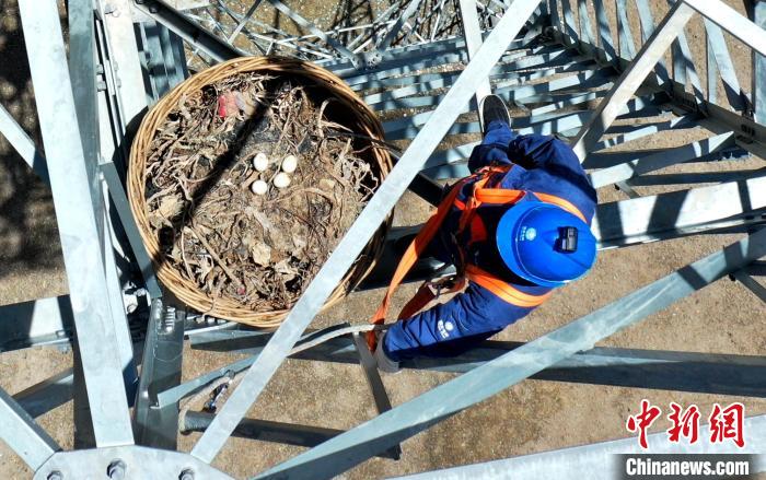 圖為國(guó)網(wǎng)青海省電力公司工作人員正在檢查人工鳥巢的情況。 國(guó)網(wǎng)青海省電力公司供圖
