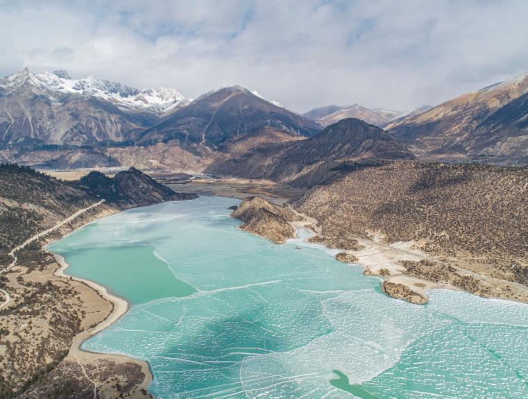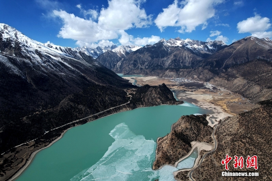 2月16日,西藏昌都,然烏湖半冰半水的湖面與雪山、藍(lán)天相互映襯,美如畫卷。(無(wú)人機(jī)照片)
