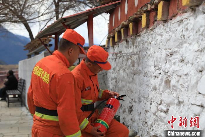 森林消防隊(duì)員檢查寺廟滅火器?!∥骼@拉翁 攝