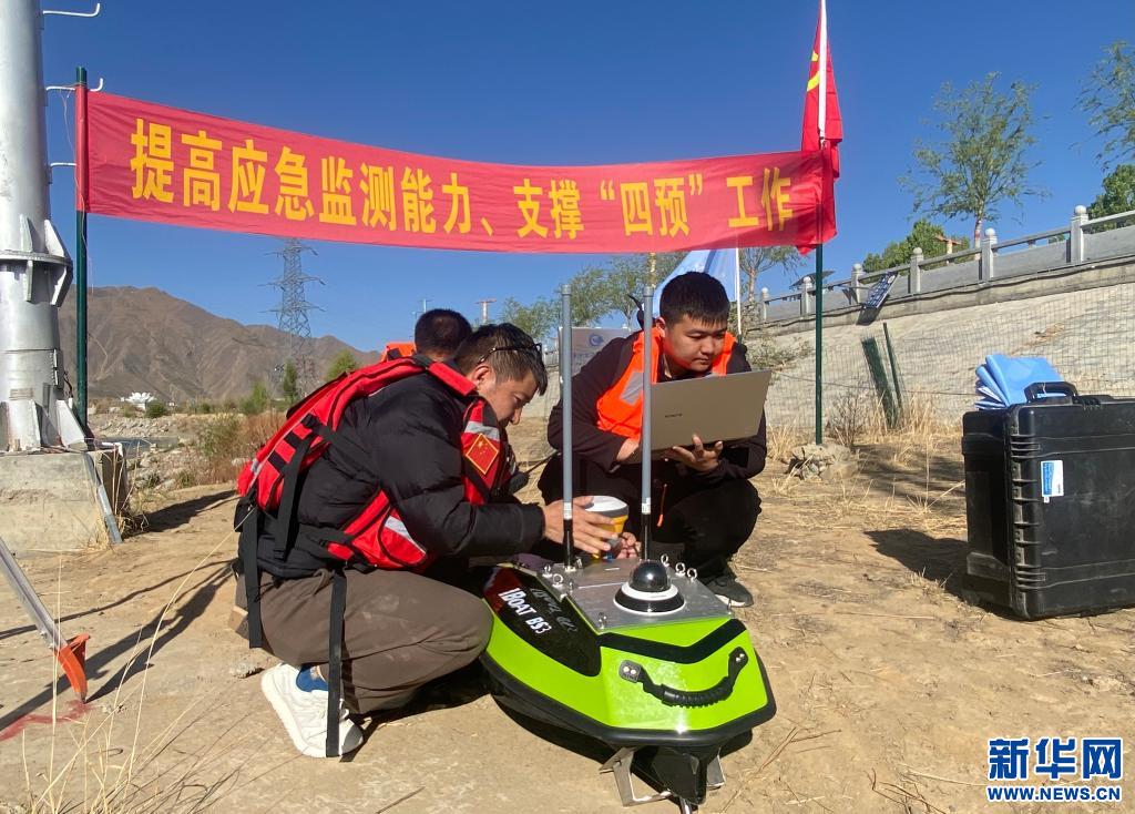 應(yīng)急演練現(xiàn)場(chǎng),參訓(xùn)技術(shù)人員正在調(diào)試水文監(jiān)測(cè)設(shè)備——無(wú)人船。(4月27日攝)新華社記者 春拉 攝