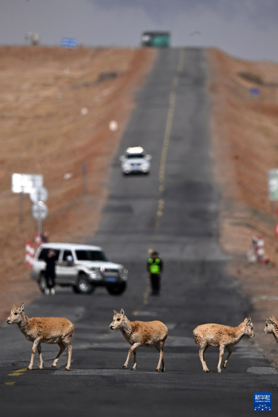 眼下,可可西里藏羚羊進(jìn)入遷徙產(chǎn)仔高峰期,記者近日在青藏公路3001公里處看到,成群的雌性藏羚羊在公路一側(cè)集結(jié),現(xiàn)場(chǎng)的工作人員對(duì)往來車輛進(jìn)行臨時(shí)交通管制。頭羊反復(fù)試探、確認(rèn)沒有危險(xiǎn)后,羊群快速通過公路,向可可西里腹地奔去。