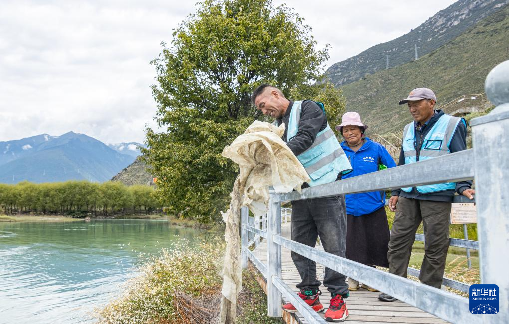 雅尼國家濕地公園管護(hù)員普布多杰(左)在巡護(hù)途中清理垃圾(9月8日攝)。新華社發(fā)(丁增尼達(dá) 攝)