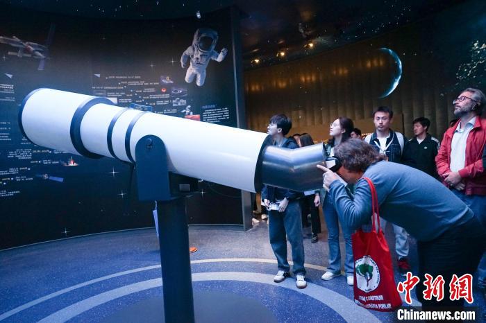 圖為一位外國政黨代表在青海省自然資源博物館內(nèi)體驗(yàn)用VR技術(shù)呈現(xiàn)的天文望遠(yuǎn)鏡。馬銘言 攝