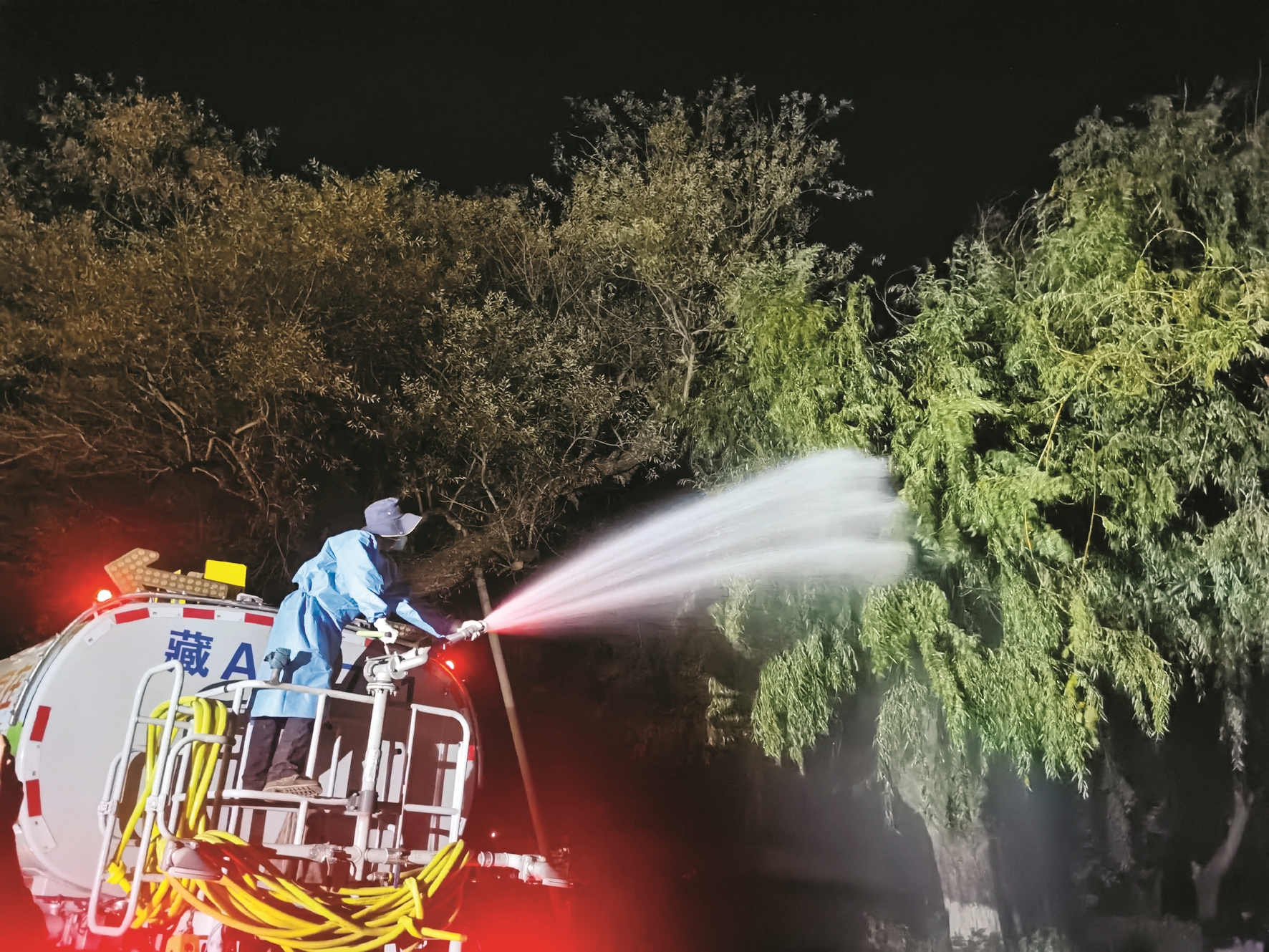 隨著夜幕降臨,羅布林卡公園內(nèi)市民游客逐漸散去,城關(guān)園林養(yǎng)護(hù)工人駕駛灑藥車開始入場(chǎng),準(zhǔn)備為園區(qū)內(nèi)的苗木進(jìn)行噴藥殺蟲作業(yè)。雨季過(guò)后,拉薩氣候較為干爽,為蟲害滋生提供了溫床,城關(guān)園林養(yǎng)護(hù)人員在前期排查發(fā)現(xiàn),羅布林卡公園廣場(chǎng)的苗木上有不同程度的柳葉蜂、柳大蚜蟲害現(xiàn)象。經(jīng)過(guò)技術(shù)人員的“把脈問(wèn)診”,確定害蟲種類、生長(zhǎng)階段后,城關(guān)園林當(dāng)天組織兩輛大型灑藥車對(duì)園區(qū)進(jìn)行集中作業(yè),以預(yù)防大范圍的蟲害以及幼蟲化蛹越冬。