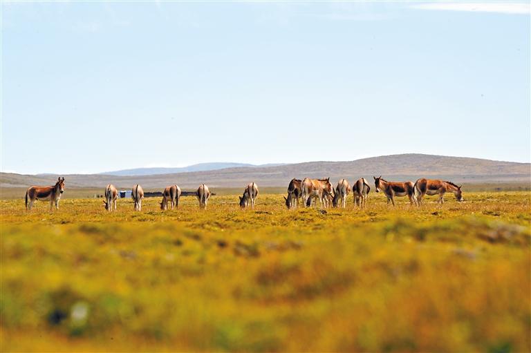 在唐古拉山以北的草原上,成群的藏野驢在覓食。記者 趙書(shū)彬 攝