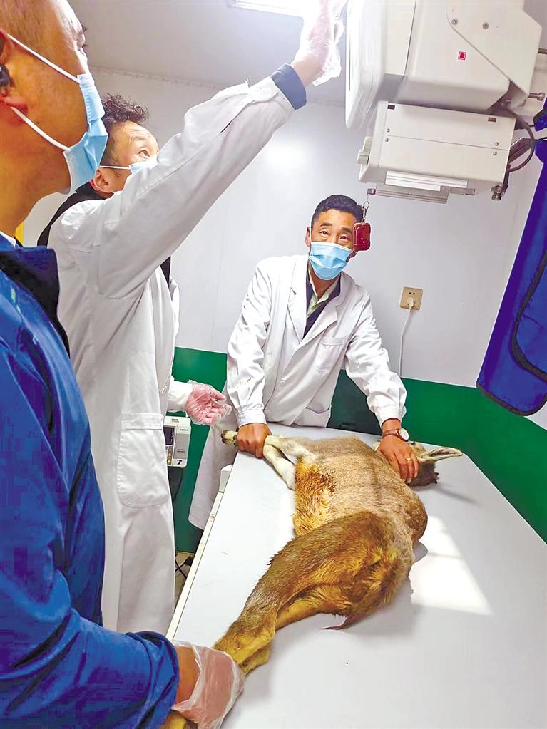 林芝市林業(yè)和草原局工作人員在救助受傷的巖羊。(林芝市林業(yè)和草原局提供)
