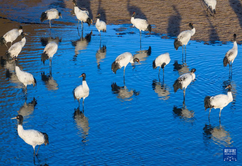 這是在拉薩市林周縣虎頭山水庫拍攝的越冬黑頸鶴(10月24日攝)。新華社記者 姜帆 攝