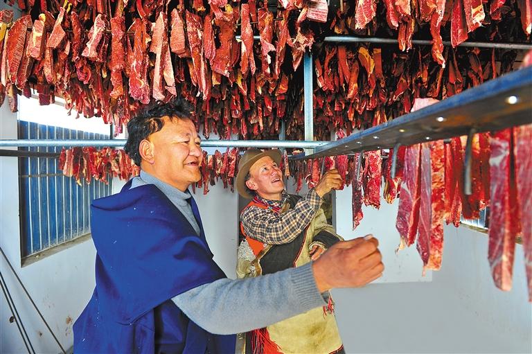 上左左農(nóng)牧民合作社經(jīng)理桑嘎石確(左)和村委會主任羅布占堆在查看晾制的風干牦牛肉。記者 溫凱 攝