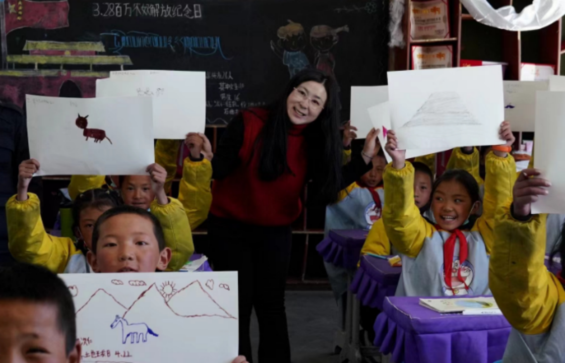 圖為“喜馬拉雅生靈的朋友”自然影像聯(lián)盟聯(lián)合創(chuàng)始人張麗娜為那曲市申扎縣第二完全小學(xué)學(xué)生講授自然教育知識(shí)。