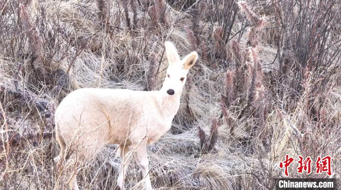4月12日,在班瑪縣森林警察大隊(duì)的協(xié)助下,班瑪縣融媒體中心記者在班瑪縣境內(nèi)拍攝到白色馬麝,它通體毛色潔白、頭部線條流暢、耳朵長而尖、身體修長而結(jié)實(shí)。