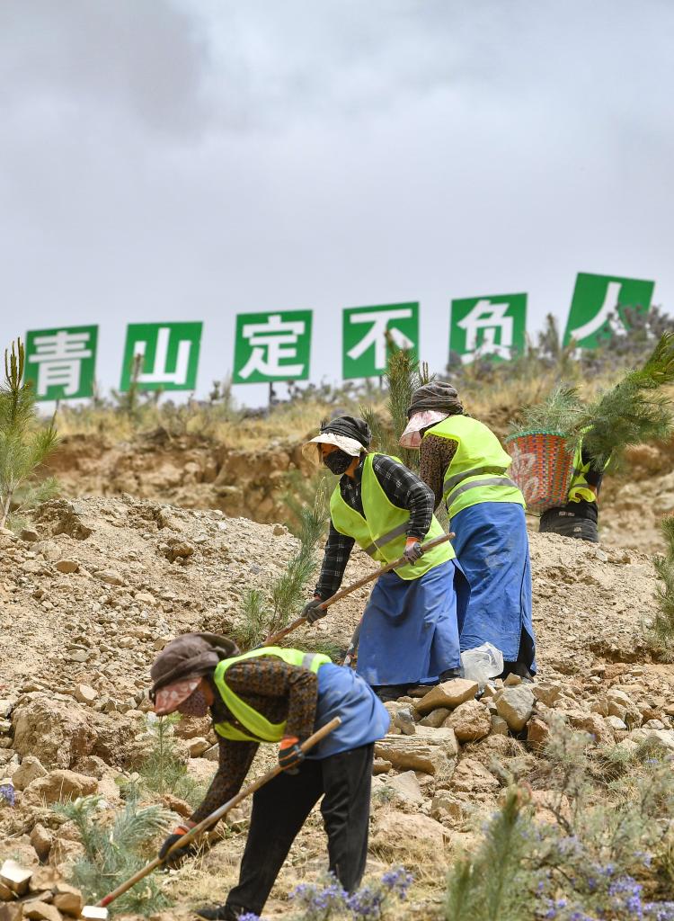 在拉薩南北山綠化2024年度一期工程貢嘎縣造林項(xiàng)目貢嘎2號(hào)片區(qū),當(dāng)?shù)卮迕裨谠詷?shù)造林(6月3日攝)。新華社記者 晉美多吉 攝