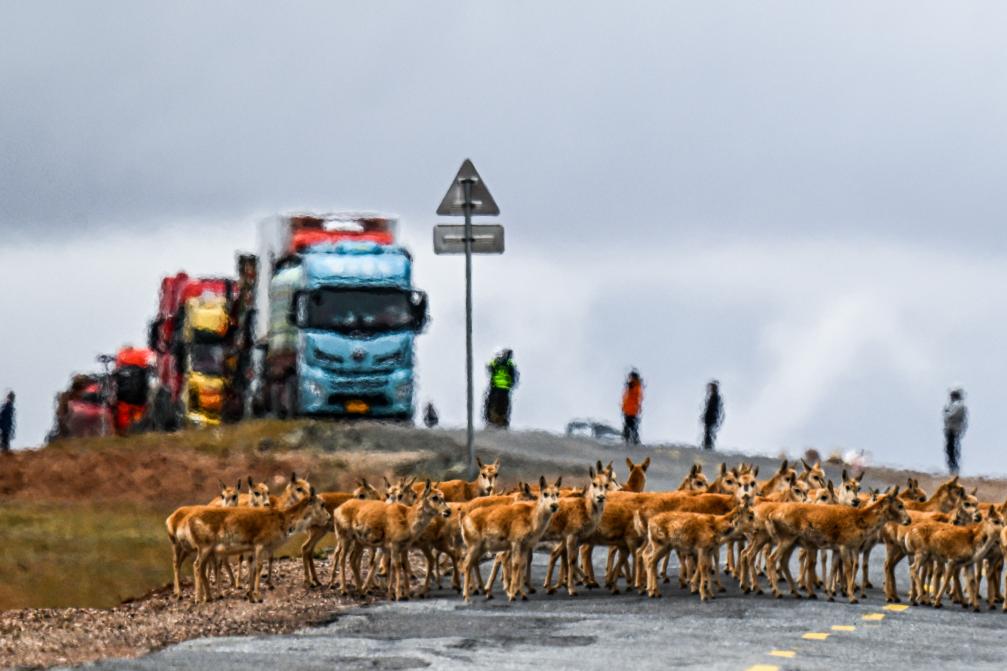 2024年5月27日,藏羚羊在可可西里五道梁地區(qū)通過青藏公路。新華社記者 張龍 攝