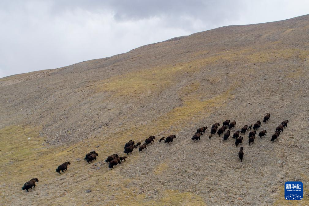 這是在那曲市尼瑪縣拍攝的野牦牛群,其中有剛出生不久的小牛犢(無人機(jī)照片,6月15日攝)。新華社記者 旦增尼瑪曲珠 攝