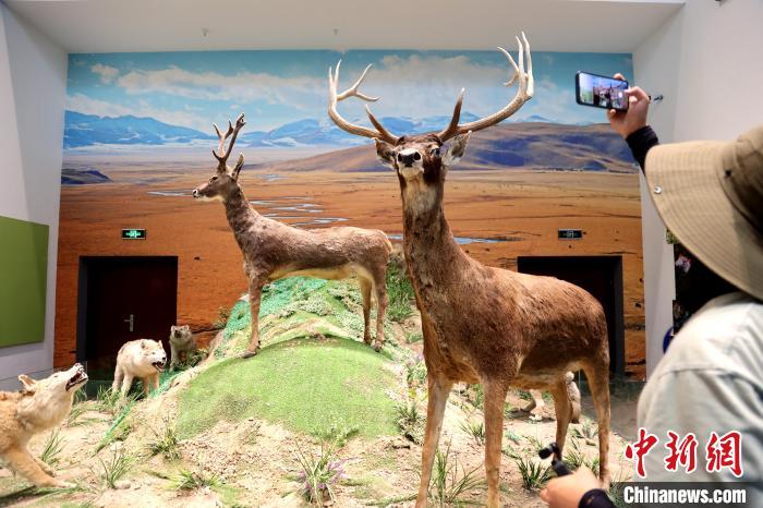 7月24日,參加“中國式現(xiàn)代化的萬千氣象·網(wǎng)絡名人青海行”活動的網(wǎng)絡名人,抵達江河源頭青海玉樹藏族自治州,在玉樹州博物館一覽自然與人文之美。玉樹州博物館是玉樹地震災后重建十大標志性建筑之一,分為序廳、自然展區(qū)、人文展區(qū)、臨時展廳。其通過實物標本等方式,展示了三江源和可可西里的野生動物、草地、森林,以及玉樹州的歷史、建筑、服飾、飲食等。圖為玉樹州博物館內(nèi)的野生動物展示。中新社記者 張?zhí)砀?攝