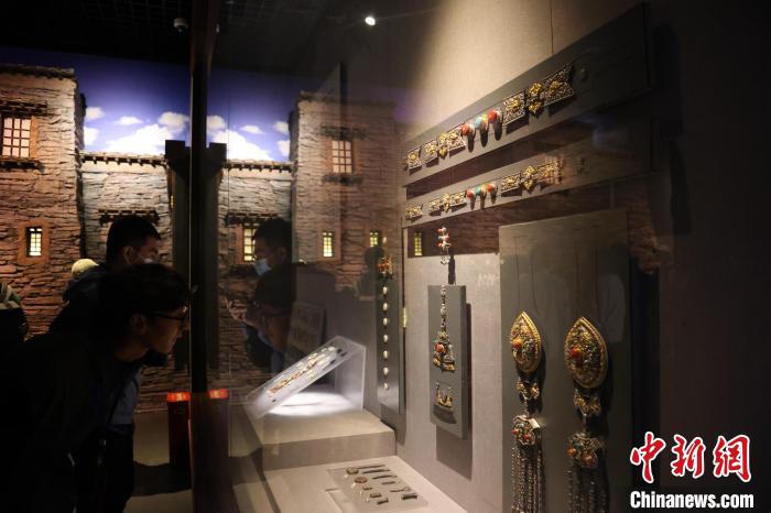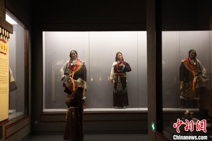 7月24日,參加“中國式現(xiàn)代化的萬千氣象·網(wǎng)絡名人青海行”活動的網(wǎng)絡名人,抵達江河源頭青海玉樹藏族自治州,在玉樹州博物館一覽自然與人文之美。玉樹州博物館是玉樹地震災后重建十大標志性建筑之一,分為序廳、自然展區(qū)、人文展區(qū)、臨時展廳。其通過實物標本等方式,展示了三江源和可可西里的野生動物、草地、森林,以及玉樹州的歷史、建筑、服飾、飲食等。圖為玉樹州博物館內(nèi)的服飾文化展示。中新社記者 張?zhí)砀?攝
