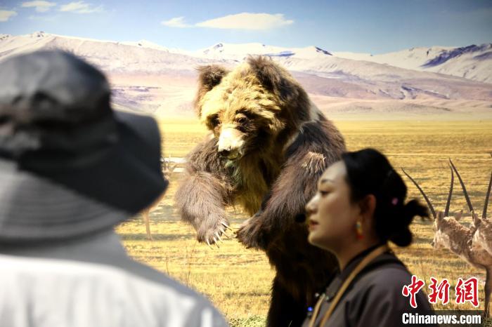 7月24日,參加“中國式現(xiàn)代化的萬千氣象·網(wǎng)絡名人青海行”活動的網(wǎng)絡名人,抵達江河源頭青海玉樹藏族自治州,在玉樹州博物館一覽自然與人文之美。玉樹州博物館是玉樹地震災后重建十大標志性建筑之一,分為序廳、自然展區(qū)、人文展區(qū)、臨時展廳。其通過實物標本等方式,展示了三江源和可可西里的野生動物、草地、森林,以及玉樹州的歷史、建筑、服飾、飲食等。圖為工作人員介紹棕熊等野生動物分布情況。中新社記者 張?zhí)砀?攝