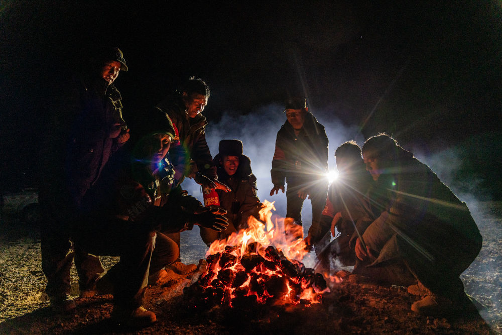 2024年5月10日,野生動物專業(yè)管護(hù)隊(duì)員在西藏羌塘國家級自然保護(hù)區(qū)的宿營地用野牦牛糞烤火取暖。