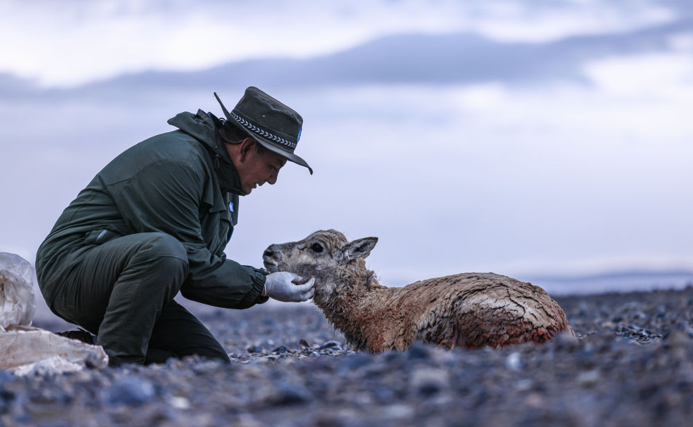 2024年6月14日,野生動物專業(yè)管護(hù)隊(duì)員在西藏羌塘國家級自然保護(hù)區(qū)核心區(qū)安撫受傷的母藏羚羊。
