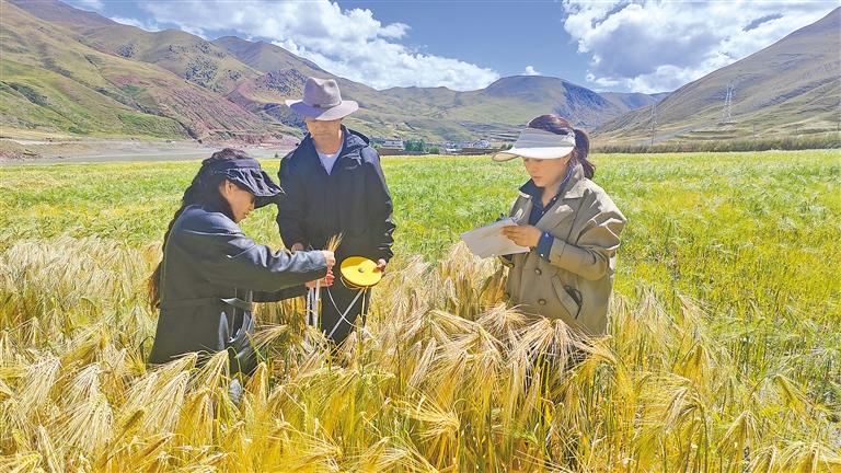 圖為比如縣相關(guān)工作人員在田間開展青稞測(cè)產(chǎn)分析工作。記者 萬靖 攝