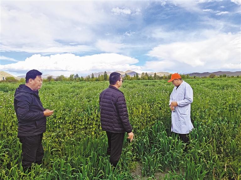 圖為浪卡子縣農(nóng)業(yè)農(nóng)村局技術(shù)人員在朗杰塘飼草基地開展技術(shù)指導(dǎo)。記者 巴桑旺姆 攝