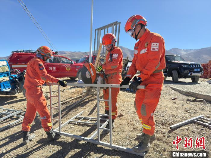 圖為消防指戰(zhàn)員正在為災(zāi)區(qū)組裝床鋪。西繞拉翁 攝