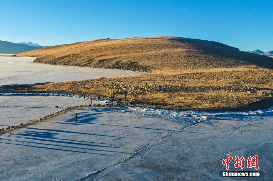 2月7日,西藏山南市浪卡子縣推瓦村1000多只羊通過普莫雍錯冰湖,前往湖心島。據(jù)悉,位于西藏山南市浪卡子縣的推瓦村,平均海拔約5070米,是世界上海拔最高的行政村,以牧業(yè)為主。由于推瓦村海拔高、夏季短,草場無法為羊群提供充足的過冬飼料,因此,每年高原最冷的時候,推瓦村牧民會把羊群趕到普莫雍錯水草豐茂的湖心島,依靠島上的草料度過最寒冷的冬期。圖為羊群到達(dá)湖心島。(無人機照片)