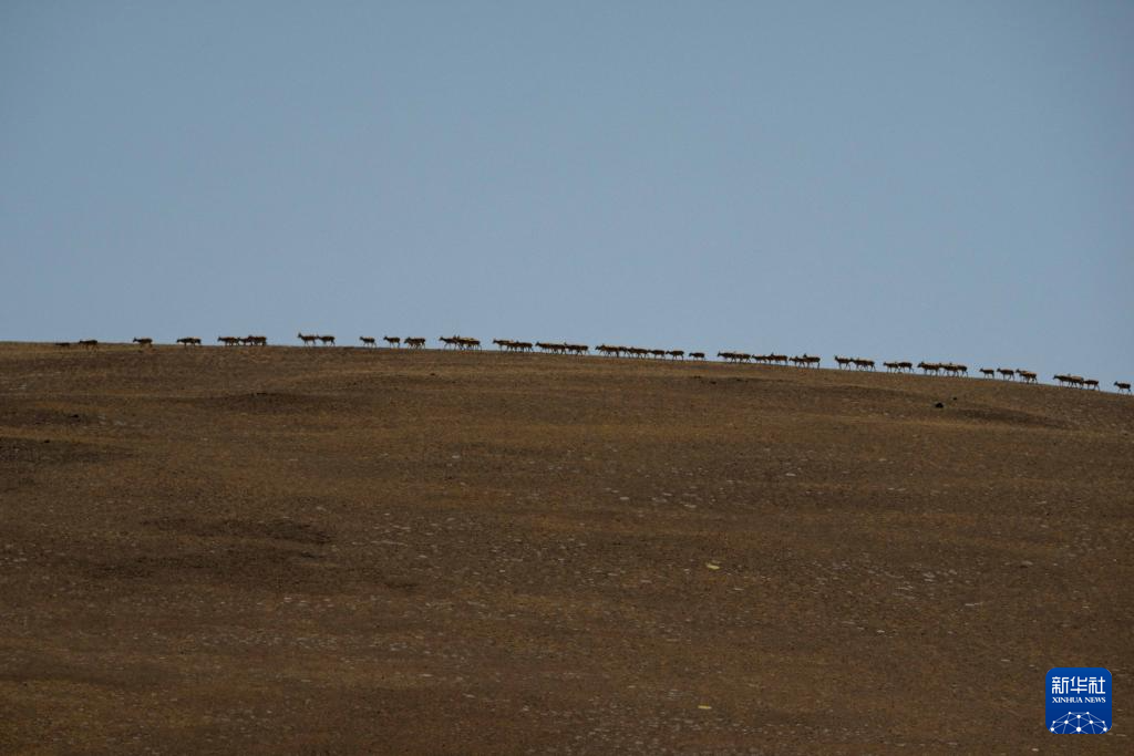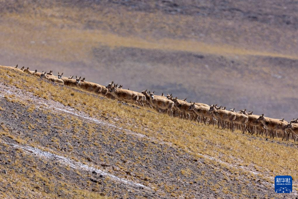 在羌塘國家級(jí)自然保護(hù)區(qū)核心區(qū)拍攝的遷徙中的雌藏羚羊群(6月9日攝)。新華社記者 旦增尼瑪曲珠 攝