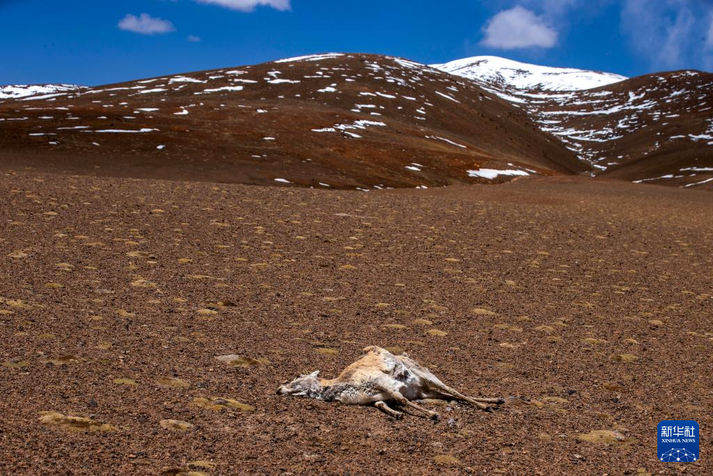 一頭雌性藏羚羊在羌塘國家級(jí)自然保護(hù)區(qū)核心區(qū)繁殖遷徙的路上死于狼口(6月8日攝)。新華社記者 姜帆 攝