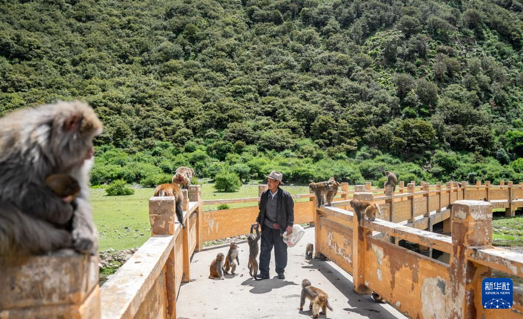 在林則生態(tài)文化旅游景區(qū),多布杰老人在給藏獼猴喂花生(7月23日攝)。新華社記者 丁增尼達(dá) 攝