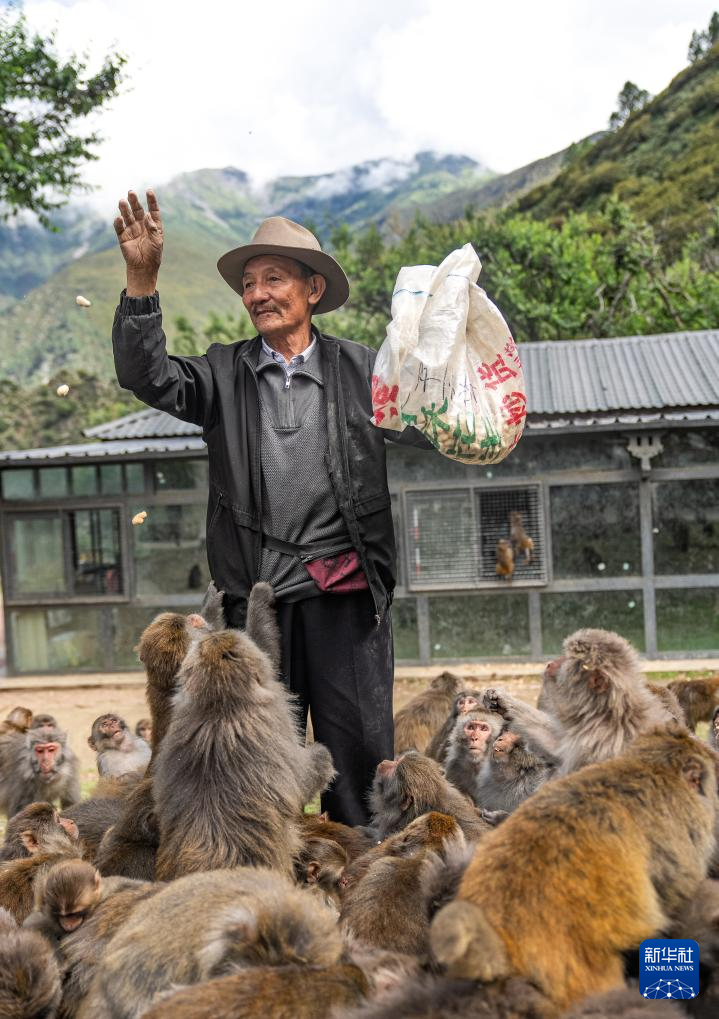 在林則生態(tài)文化旅游景區(qū),工作人員在為多布杰老人(中)準(zhǔn)備喂藏獼猴吃的花生(7月23日攝)。新華社記者 丁增尼達(dá) 攝