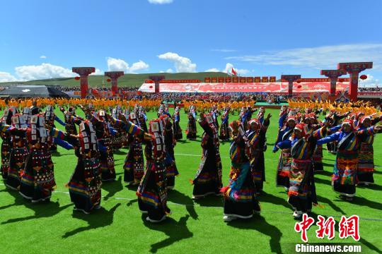 2019年8月10日,西藏那曲牧民參加一年一度的賽馬節(jié)。圖為當(dāng)?shù)嘏越M成的大型鍋莊舞團(tuán)隊(duì)在開幕式上進(jìn)行表演。(資料圖) 江飛波 攝