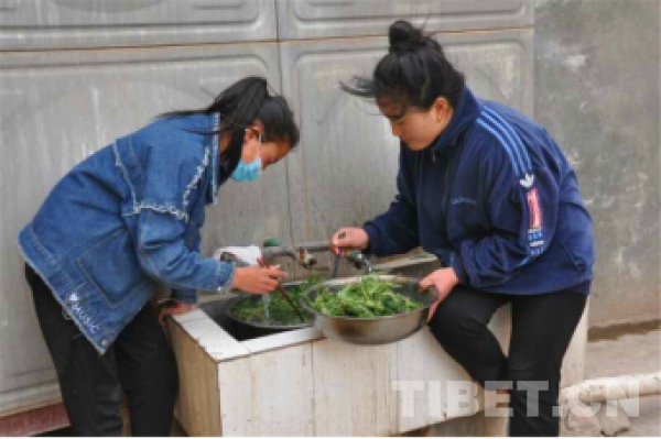 圖為在四川巴塘讀七年級(jí)的扎西央宗(左)在家洗野菜 攝影:唐大山