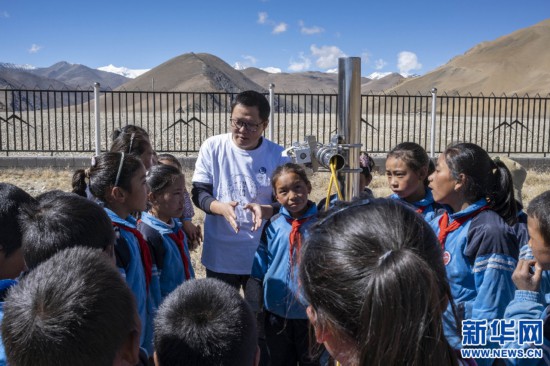 5月23日,工作人員為參加“公眾科學(xué)日”活動的學(xué)生介紹珠峰站內(nèi)的科研設(shè)備。新華社記者 孫非 攝