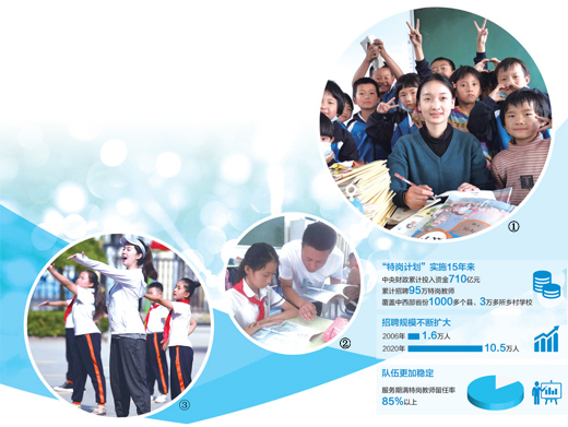 15年來,“特崗計劃”共為中西部地區(qū)22個省份1000多個縣的3萬多所鄉(xiāng)村學(xué)校和教學(xué)點補(bǔ)充95萬名中小學(xué)教師。通過“特崗計劃”直接或間接補(bǔ)充的教師,是新中國成立以來數(shù)量最多、學(xué)歷最高、待遇保障最為齊全的新一代鄉(xiāng)村教師。