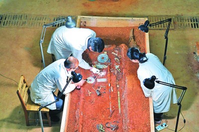 考古工作人員對江西南昌西漢?;韬钅箞@五號墓的內(nèi)棺進行清理。新華社發(fā)